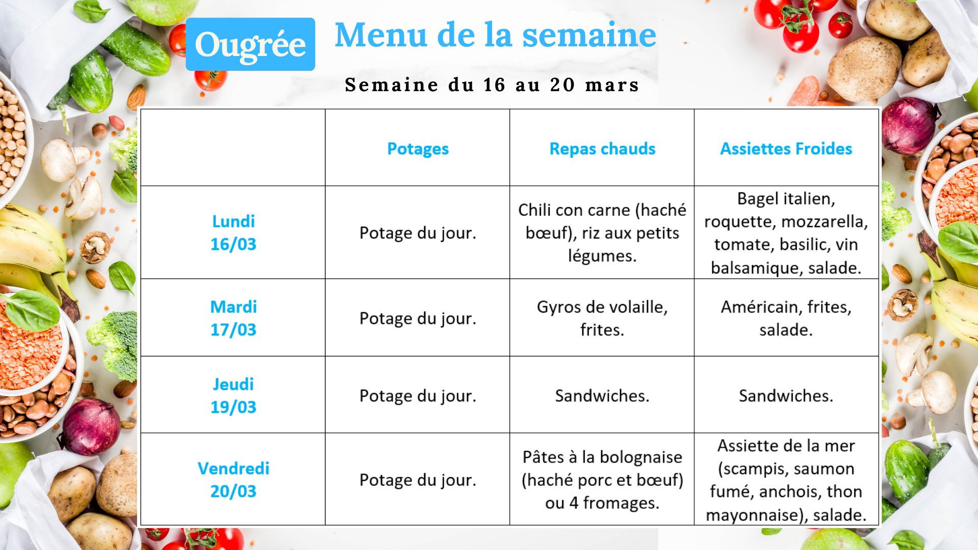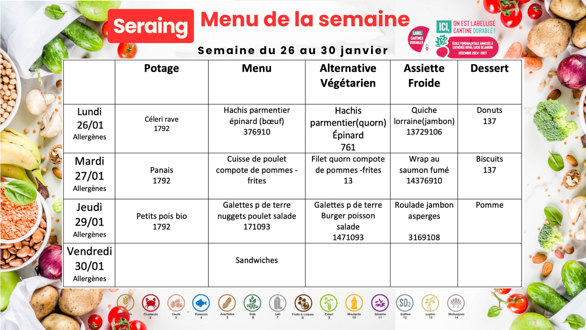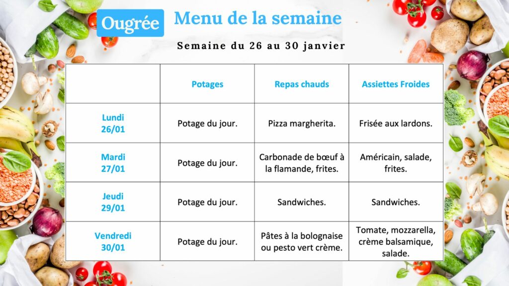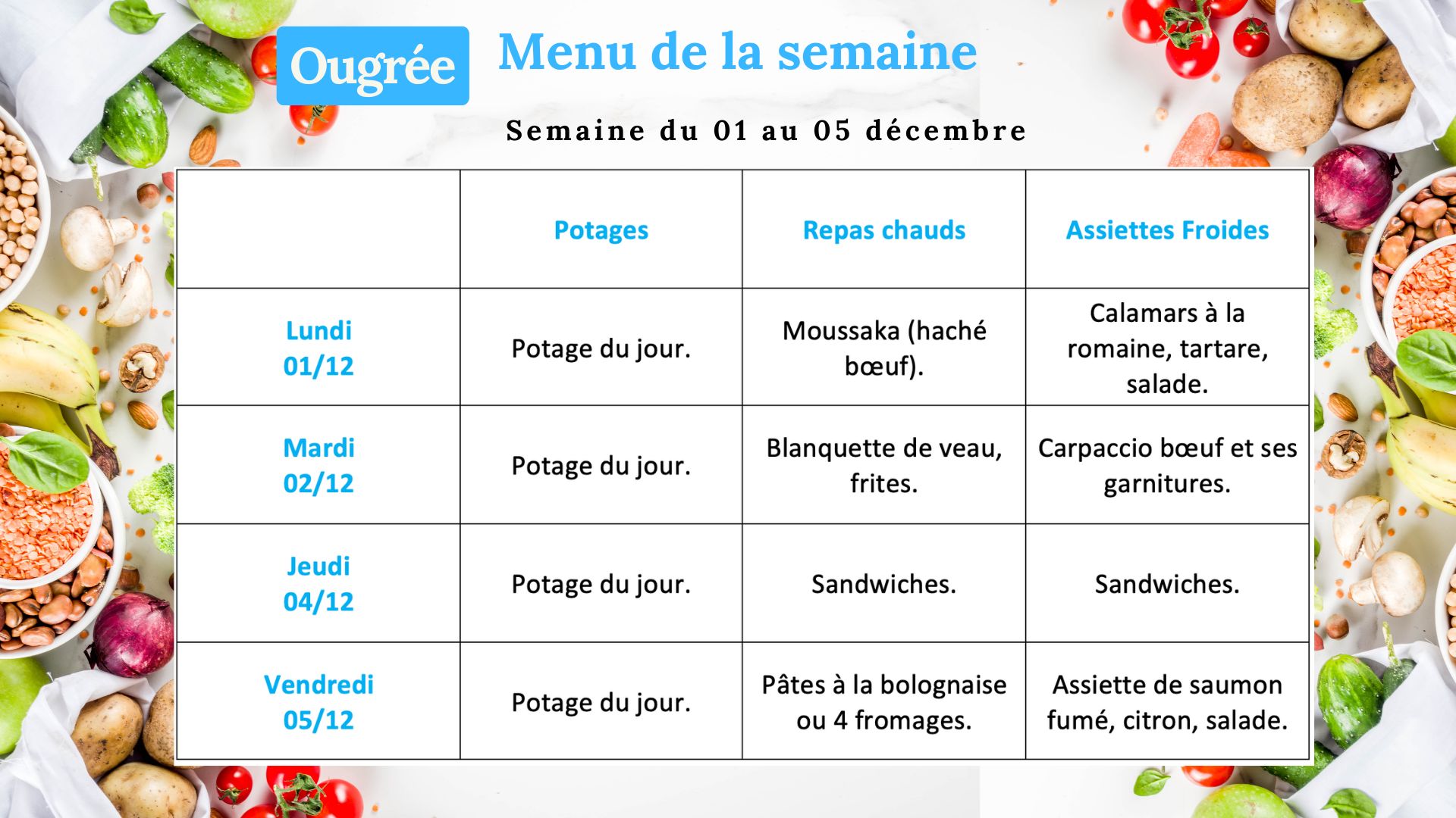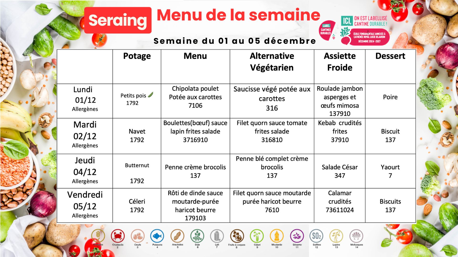 Pour le repas chaud, chaque vendredi les élèves reçoivent  le menu pour la semaine suivante. Un ticket de dîner coûte 3 EUR (potage + repas + dessert + eau à volonté). Chaque jour, sauf le mercredi, les élèves  peuvent commander un sandwich à l’école.